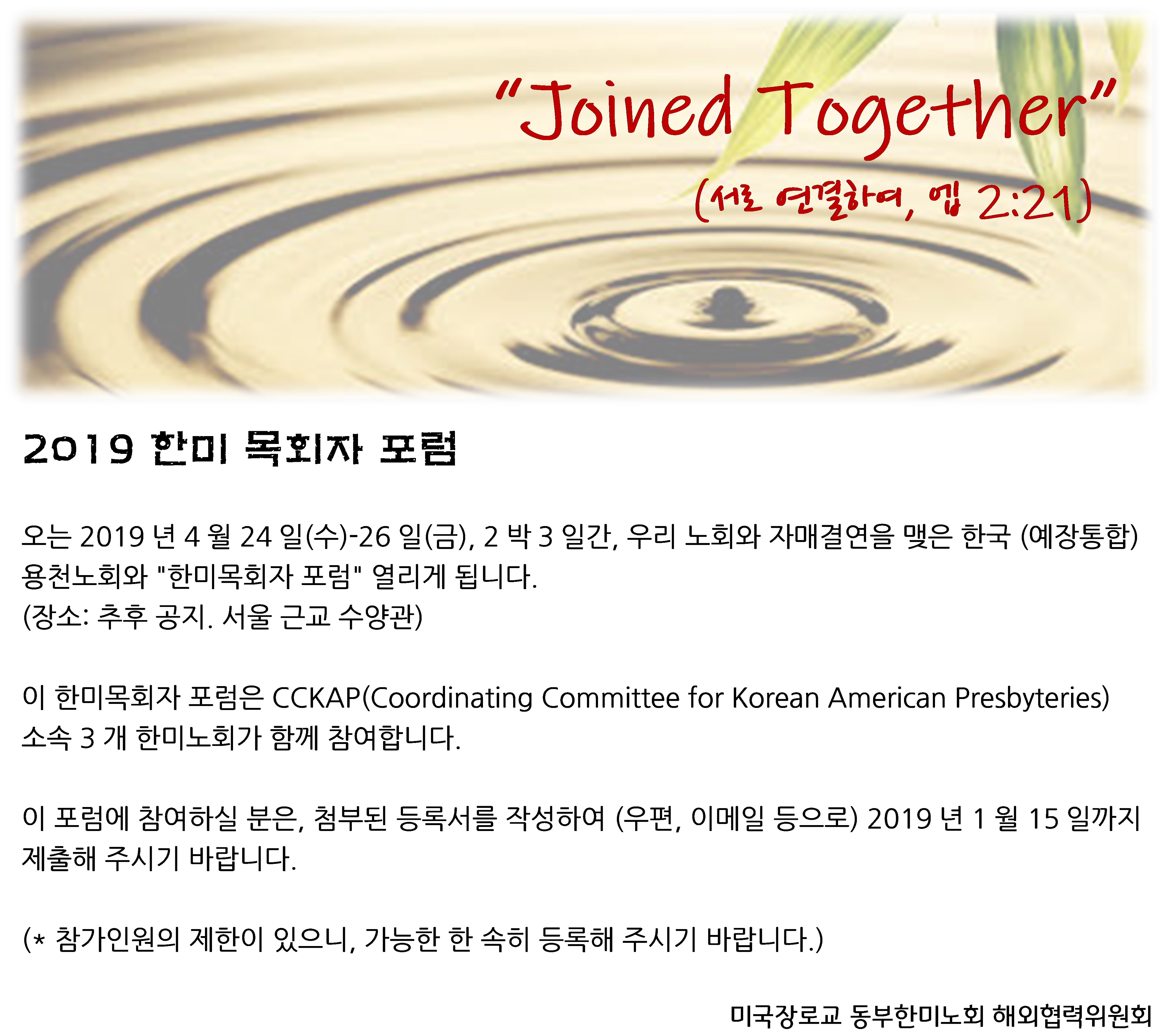 제목"한미목회자 포럼" 등록 안내2018-11-30 18:30작성자ekpc첨부파일한미목회자포럼등록.pdf (518.3KB) 목록 이전2019년 노회 행사계획ekpc2019-01-01-"한미목회자 포럼" 등록 안내ekpc2018-11-30다음제 88차 정기노회 안내 (2018년 12월 4일)ekpc2018-11-25 Powered by MangBoard | 워드프레스 쇼핑몰 망보드